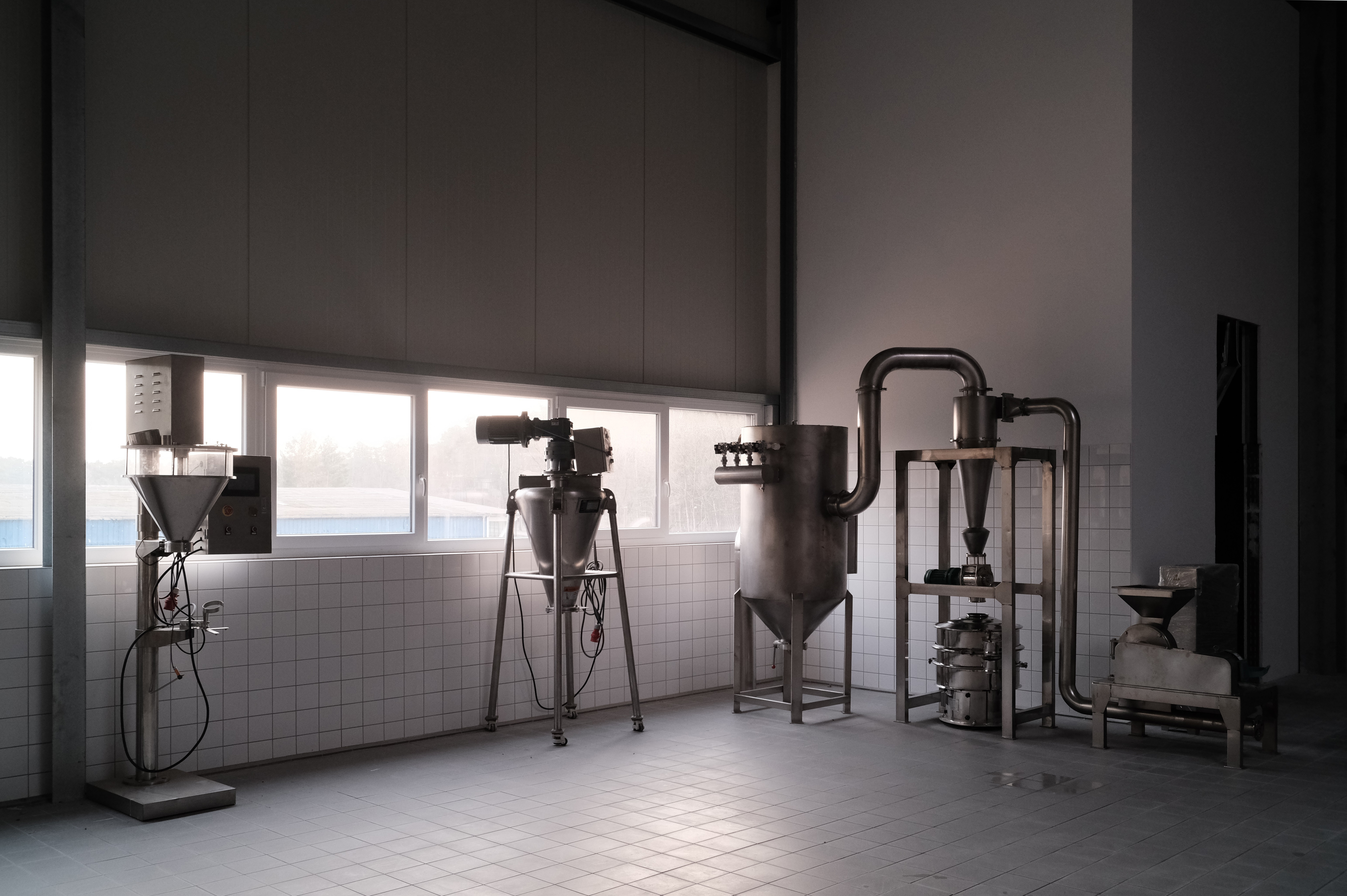 Diese Woche haben wir angefangen diesen Produktionsabschnitt aufzustellen. Die Geräte waren teilweise schon im alten Gebäude in Betrieb aber z.B. der große Kessel für 300 Liter Ansätze und der Pulverzerkleinerer/Sortierer stehen jetzt erstmalig zur Verfügung.