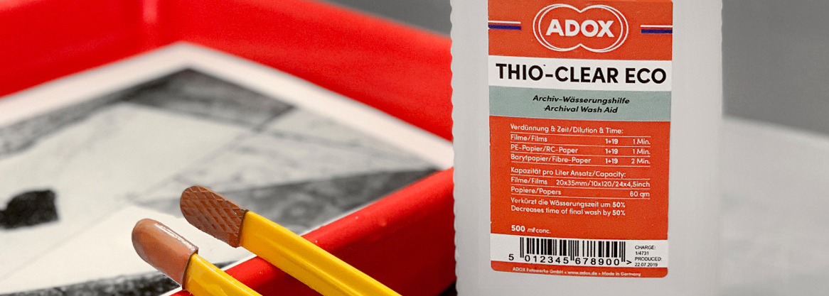 Das neue THIO-CLEAR ECO hilft rund 50% schneller zu wässern und Wasser zu sparen. Mit THIO-CLEAR behandelte Prints sind sicher und archivfest ausgewässert und zeigen beim Tonen keine Fixierflecken. Bei der Konzeption wurde besonders Wert auf die Umweltverträglichkeit gelegt. THIO-CLEAR ist ungiftig und umweltneutral. [button size='small' arrow='no_arrow' color='#ffffff' background_color='#eb651d' font_size='' line_height='' font_style='' font_weight='' text='THIO-CLEAR Produktseite' link='https://adox.eu/Photo/adox-thio-clear-eco/' target=''] [button size='small'...