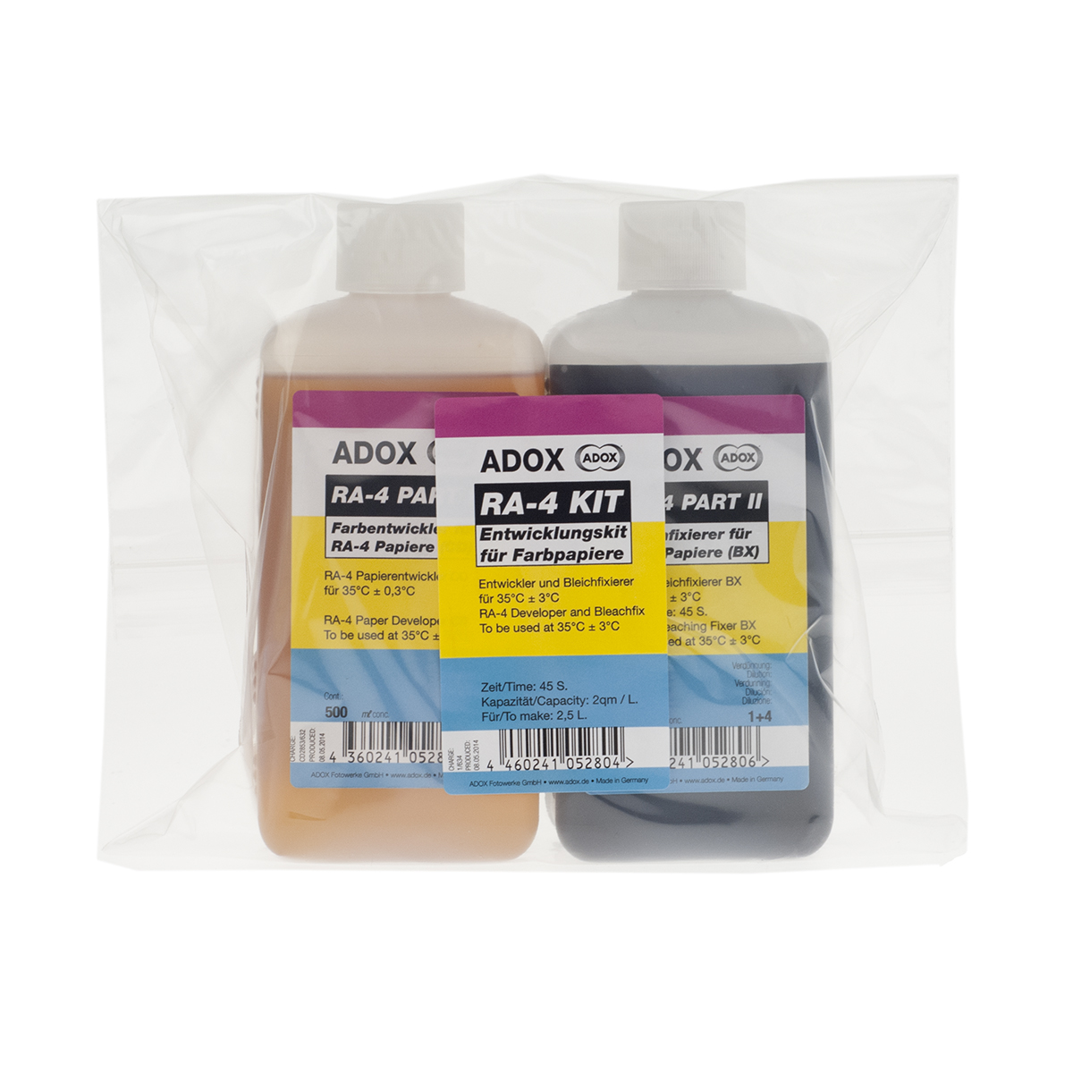 The kit contains everything you need to develop colour paper: Developer and Bleachfix.