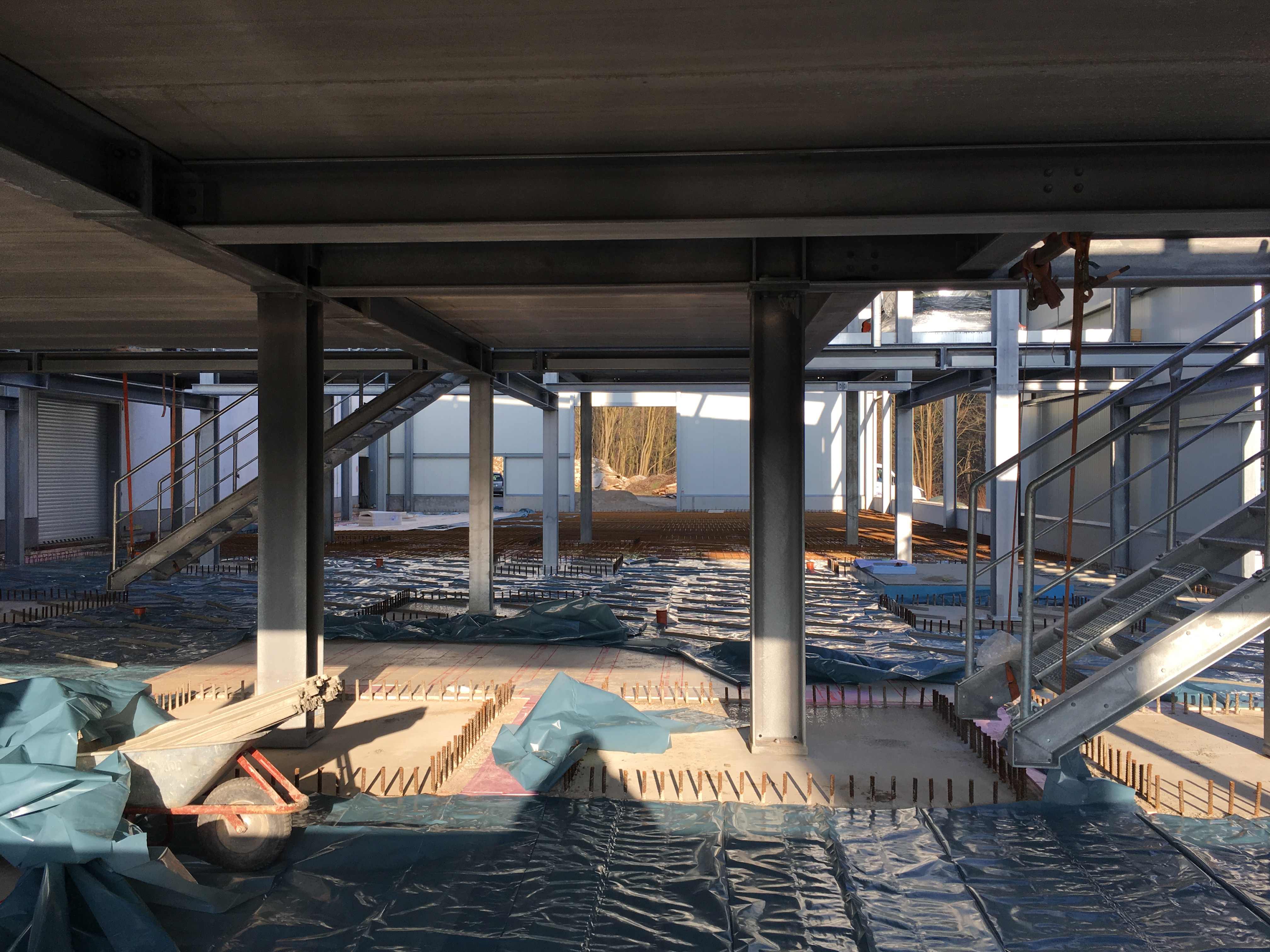 The outer fassade is closing. The Southbound and northbound walls are already set and the long side facing east is currently being mounted. Inside the floor is being constructed.